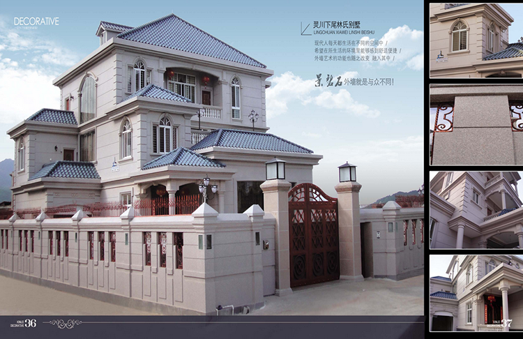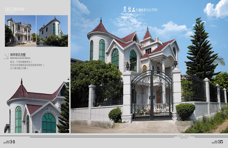 適用于山莊別墅、酒店、賓館、娛樂場所、商業(yè)會所等建筑物內(nèi)外墻大面積使用。